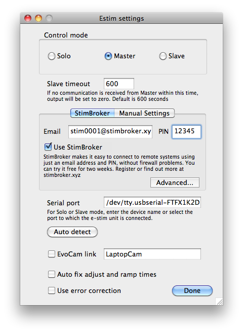 Control mode is one of the main settings. If you are just stimming on your own, with no remote control, choose Solo. This is for a 2B connected directly to your computer - you can choose the serial port further down the screen. If you are controlling someone else's 2B over the internet, choose Master mode. If you want someone to be able to control your 2B, select Slave.