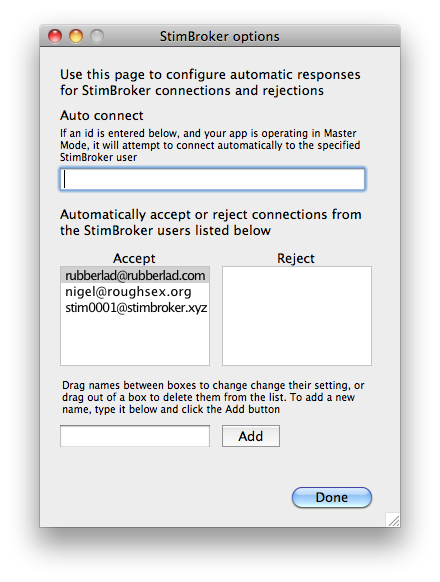The right hand screen shows the Advanced StimBroker settings. This can be used to automatically accept or reject connections from specified users or, if you are connecting in Master mode, to choose a user that you will try to automatically connect to.